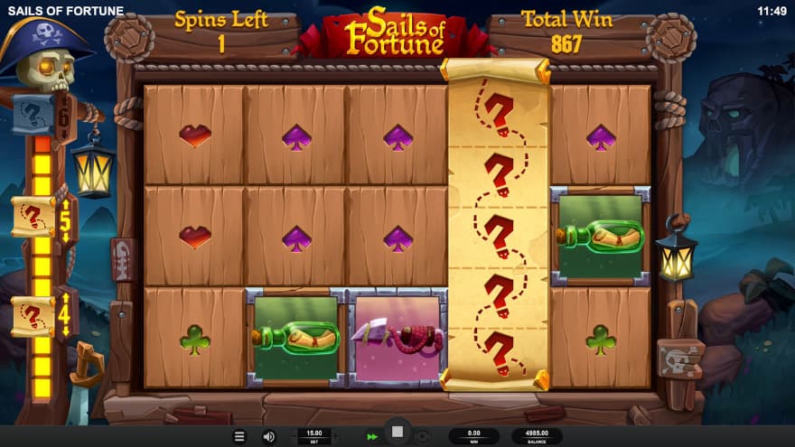 The lower paying symbols consist of the suit’s clubs, spades, diamonds and hearts. If you get 5 of these, it gives 1X the bet. The medium paying symbols consist of fish bones, bottle post and a harpoon. If you get 5 of these, it gives 1.5X - 3X the bet. The higher paying symbols are a female and a male pirate. If you get 5 of these, it gives 5X - 8X the bet, where the male pirate also gives a win already with 2 adjacent symbols. The game's Mystery map consists of a treasure map with a large red question mark, this symbol will be very helpful in the hunt for the big wins. The game's scatter symbol consists of a golden key with the text scatter on it and the game's treasure chest consists of, well a treasure chest. The spins you make are gilded by typical pirate music where you hear flute, accordion and fiddle, among other things. Let's find out what the features do.