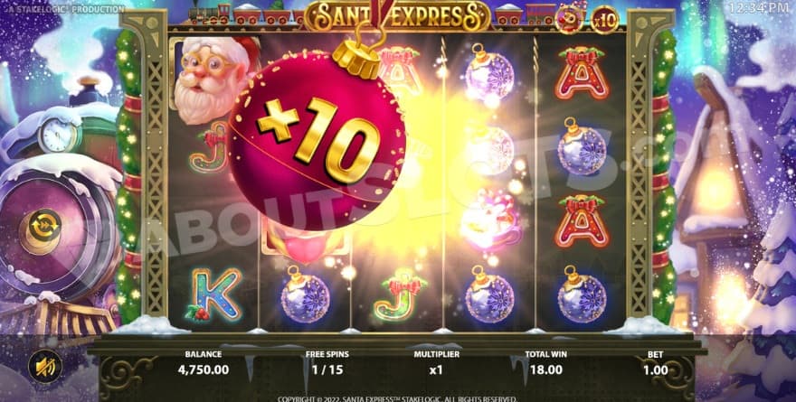 When landing three Scatters and triggering the free spins, Santa will fly in and show a random amount of free spins and a win multiplier. You can receive 8, 10, 12 or 15 free spins and 2x, 3x, 5x, or 10x win multiplier. A random symbol will also be chosen, paying double the paytable amount during the feature.