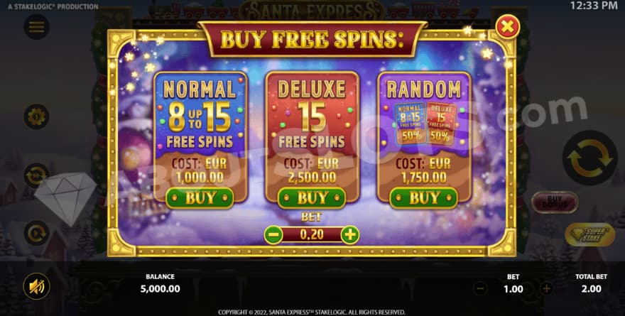 Santa Express is a video slot from Stakelogic that features 5 reels, 4 rows, and 20 paylines. You can choose between a Min.bet of 0.20 and a Max.bet of 200. It has a default RTP of 96.17%, but casino operators can also choose lower RTPs; 93.80%, 90%, and 88%. Keep this in mind if you try the game out, and check what RTP your casino site has chosen. Santa Express plays at high volatility and offers a high max win of 20,000x the bet.