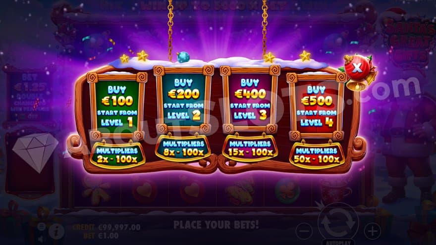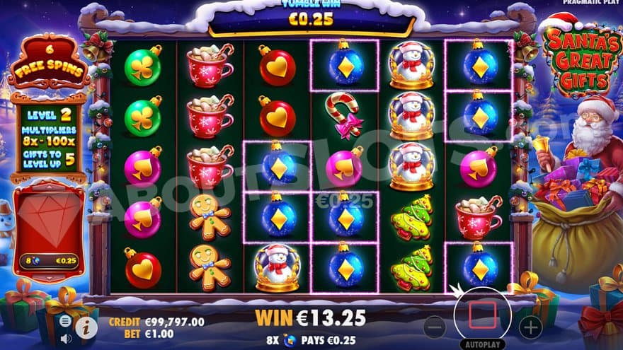 Christmas presents in green, blue, purple, and red, carrying a multiplier, can land anywhere on the reels in the base game and free spins. The multiplier has a random number between 2X and 100X. The symbol, or symbols, stay on the reels until all wins are finished in a tumble, and the multiplier value is then multiplied by the final win. If several multiplier symbols are used, their values are added together before it’s used on the final win.