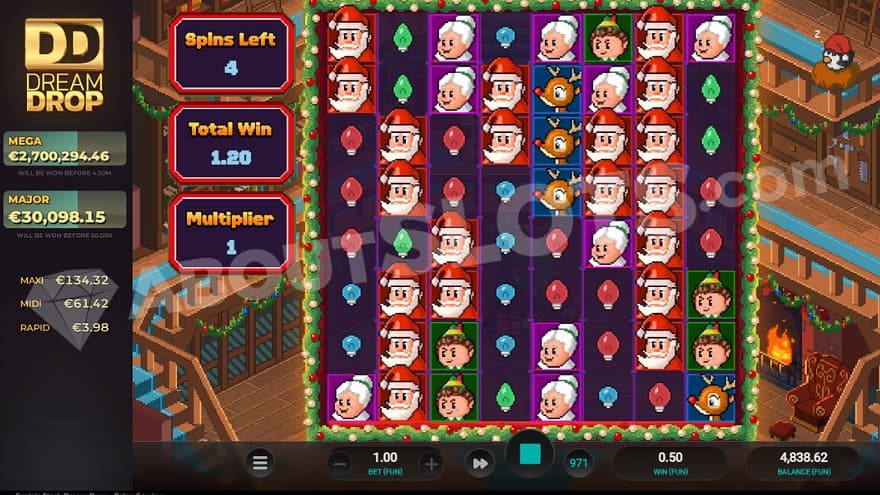 The Dream Drop Bonus can trigger randomly on any base game spin. It will present 15 yellow and red Christmas gifts, and the player gets to choose one at a time by clicking on them. Behind each gift is one of the five Jackpots Rapid, Midi, Maxi, Major, and Mega. The player wins the first Jackpot to be revealed 3 times.