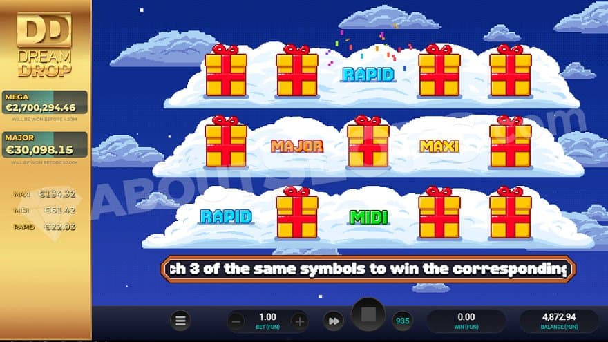 You can win up to 20000X the bet plus the progressive Dream Drop Mega Jackpot, which pays up to €3 million.
