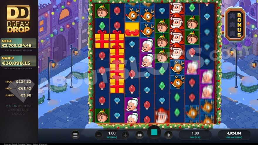 Santa’s Stack Dream Drop is a video slot from Relax Gaming with 8 reels and 8 rows. There are no regular paylines; wins are instead made by landing at least 5 symbols in a cluster, connected either horizontally or vertically. The Min.bet is 0.2, and the Max.bet is 50. This Jackpot slot has an RTP of 94.00%, which is typical for the Dream Drop games. The volatility is high, and the max win is 20000X the bet, except from the Jackpot that awards up to €3 million.