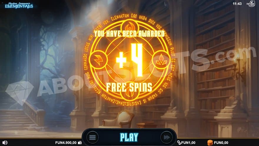 The Free Spins trigger by landing 4 Scatter Symbols on the reels on level 4 in the bonus game. Free Spins start at level 0, offering 4 spins. The 4 Elementals are discharged in a random order, and the latest discharged Elemental symbol is guaranteed to be used. Every winning symbol adds 1 to the Free Spins Elemental Meter. If the meter has reached its threshold at the end of the 4 spins, the feature levels up and awards 4 more spins: