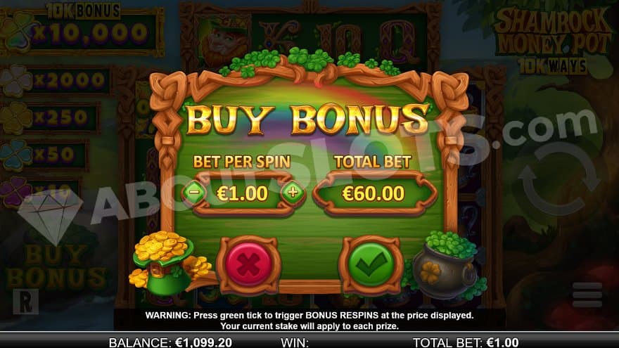 Paying 60X the bet will get you a spin that guarantees to trigger the Shamrock Bonus Respins. The spin will have between 6 and 12 scatter symbols. Playing the Bonus Buy increases the RTP to 97.03%.