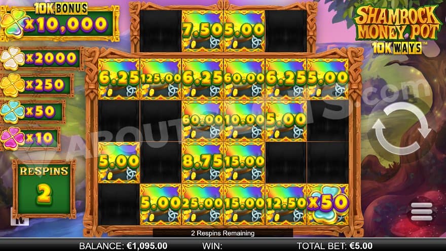 The Scatter Symbol is a pot of gold coins, or a four-leaf clover, containing a cash prize. You can’t make regular wins with the scatter, and the cash prize only matters if you activate the Shamrock Bonus Respins. To trigger the Respins, you’ll need to land at least 6 scatters anywhere on the reels. The gold pots have a cash value of 1-100X the bet, and the four-leaf clovers come in 5 colors, paying 10X, 50X, 250X, 2000X, and 10000X the bet.