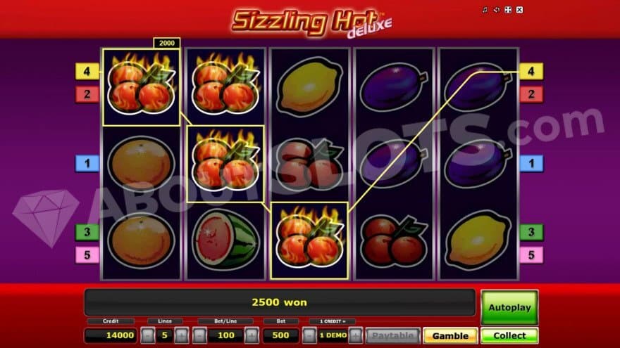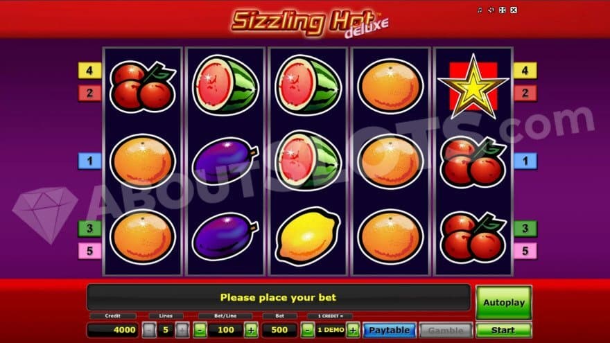 Sizzling Hot Deluxe is a video slot from Novomatic containing 5 reels and 3 rows. You bet on 5 fixed paylines; there’s no option to play on less. The Min.bet is 0.05 and the Max.bet is 50. Sizzling Hot Deluxe comes with medium volatility and an RTP of 95.66%, where you can win up to 5000X the bet.