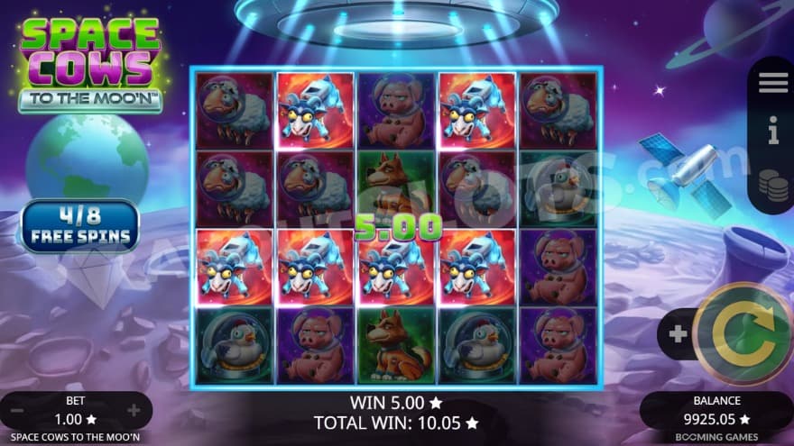 The Wild Symbol of the game has the design of a cow with the text “WILD” and can appear on reels 2, 3, and 4. The Scatter Symbol is a UFO with the text “FREE SPINS,” landing 3 or more of this symbol type can trigger the Free Spins feature. Let’s find out what kind of features this game has to offer!