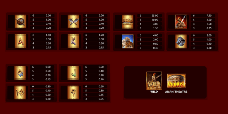 This game comes with as many as 14 different symbols. Where the first lower paying symbols consist of the classic 9, 10, J, Q, K and A. These are very common in the game. So, despite their lower value, they can for sure pay out smaller amounts much more often. Battle axes, swords with shields and helmets as slightly higher paying symbols is something you will see quite often as well. We then have a tiger symbol and Spartacus himself. With a Spartacus Megaways symbol as the highest paying one. Then, finally it is two symbols left that consist of a wild, where you see a fighting Spartacus and finally a bonus symbol in the form of the Amphitheatre, a scatter in other words.