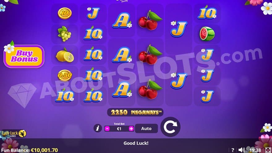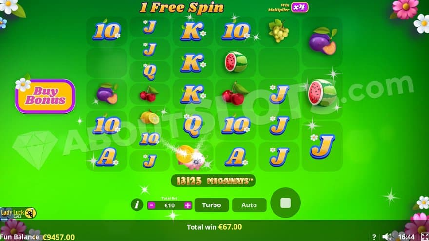 The lower-paying symbols are 10, J, Q, K, and A. They all pay the same, giving 0.8X the bet for a 6-of-a-kind win. The higher-paying symbols are lemon, grapes, cherries, plum, and watermelon. Landing a win containing 6 of those symbols pays between 1.5X and 4X the bet. You need 3 Scatter Symbols to trigger the free spins, and there’s no Wild Symbol. There is also a Coin and a Collector Symbol.