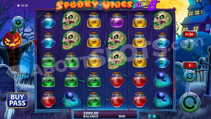 Spooky Vibes Accumul8 is a video slot from Light & Wonder with 6 reels and 5 rows. The game doesn’t use regular paylines; instead, it pays anytime 8 or more symbols land on the screen, no matter where they end up. The Min.bet is 0.2, and players have to set with the Max.bet 10. The default RTP is 96.06%, but Light & Wonder has also released versions with lower RTP of 94.15% and 90%. The volatility is medium and the max win is a solid 20000X the bet.