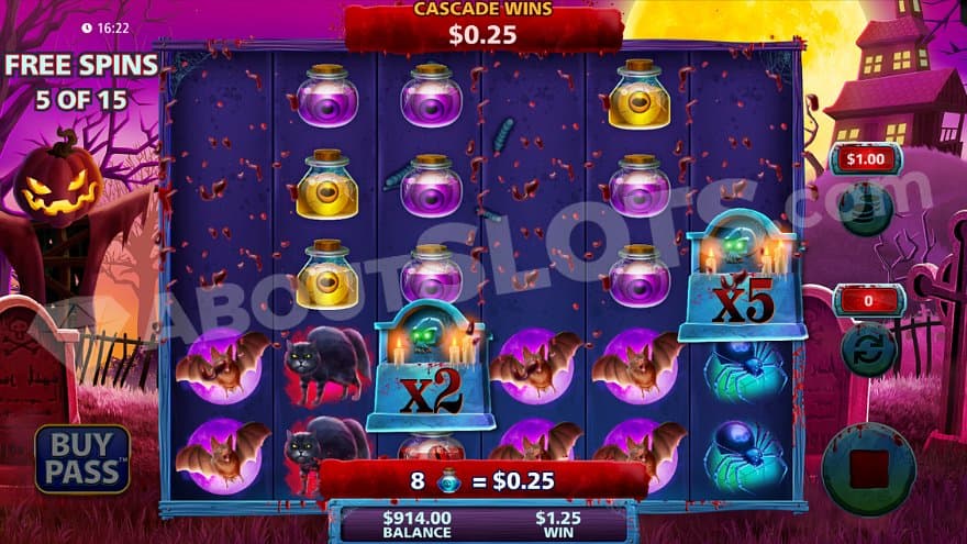 The lower-paying symbols on the graveyard are five glass jars containing a human eye. Landing 12 or more of the blue, green, purple, red, or yellow jar awards between 2X and 10X the bet. The higher-paying symbols are a spider, a death skull, a screaming bat, and a black cat. These guys will give you between 12X and 50X the bet for a win containing at least 12 symbols. There’s no Wild Symbol, and the Scatter Symbol, which can trigger the free spins, is depicted by a pumpkin head with glowing eyes. You’ll also find Multiplier Symbols in the free spins.