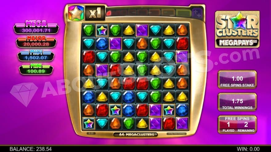 Star Clusters Megapays is a video slot from Big Time Gaming. It has 4 reels and 4 rows that can expand up to 16 each in the free spins feature. The Min.bet is 0.20 and the Max.bet is 20 in this game with very high volatility. The game’s RTP is 96.27% and the max win is 27050X the bet, apart from the progressive Mega Jackpot that starts at €300000.