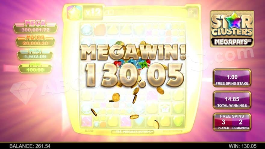 Star Clusters Megapays is a new casino slot from Big Time Gaming based on Star Clusters Megaclusters but with higher volatility and even higher wins. This new release has the same Megasclusters mechanic that splits all winning symbols in the 4X4-grid into four positions, making way for up to 64 symbols to hit the screen. While in the free spins feature, the grid can expand from 8X8 to 16X16, holding up to 256 symbols. The Star Clusters Megapays is also equipped with a progressive Mega Jackpot with a minimum win of €300000. Now let’s have a deeper look at this video slot that looks like it is floating in space, just waiting to explode in high wins.