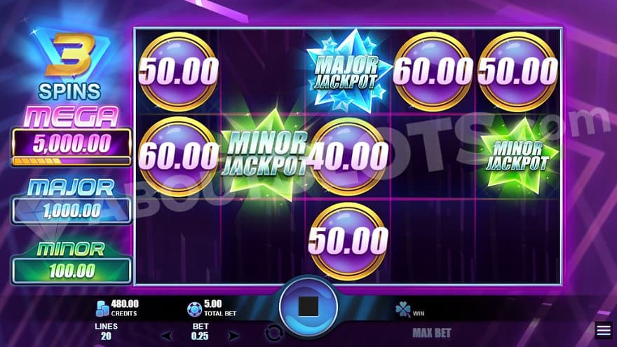 There are two different Booster Symbols. The Upgrade Booster says +1 and increases all Star Coins by the amount of the bet. The x2 Multiplier Booster doubles the value of all Star Coins. The Bonus Jackpot Symbols Minor and Major are worth 20X and 200X the bet. If you fill all 15 positions on the grid, you’re awarded the Mega Jackpot of 1,000X the bet.