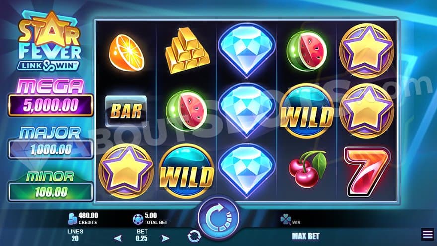 Star Fever Link&Win takes you to a colorful place where the base game goes in blue. The background has blue and white stripes of light, and the semi-transparent grid has a darker background. To the left of the reels are the Minor, Major, and Mega Prizes on display, and the buttons to play the game are at the bottom of the screen. You make wins by landing 3 or more of the same type of symbol on a payline going left to right. All wins must start on the first reel to the left, and you can play the game on all sorts of devices, such as mobile phones, notepads, and desktop computers.