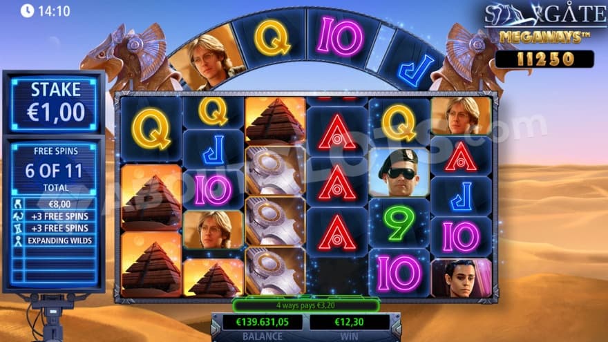 The lower paying symbols are 9, 10, J, Q, K and A. Landing 6 of the same symbol type pays between 0.5X to 0.8X the bet. The higher paying symbols are a pyramid, a portal, Dr. Daniel Jackson, Colonel Jonathan "Jack" O'Neil and Jaye Davidson as Ra. Landing 6 of the same symbol type pays between 1.5X to 10X the bet. The game's wild symbol consists of a golden amulet showing the eye of Ra, while the symbol showing only the eye of Ra, appropriately enough, is the Eye of Ra symbol. Let's find out what the features do.