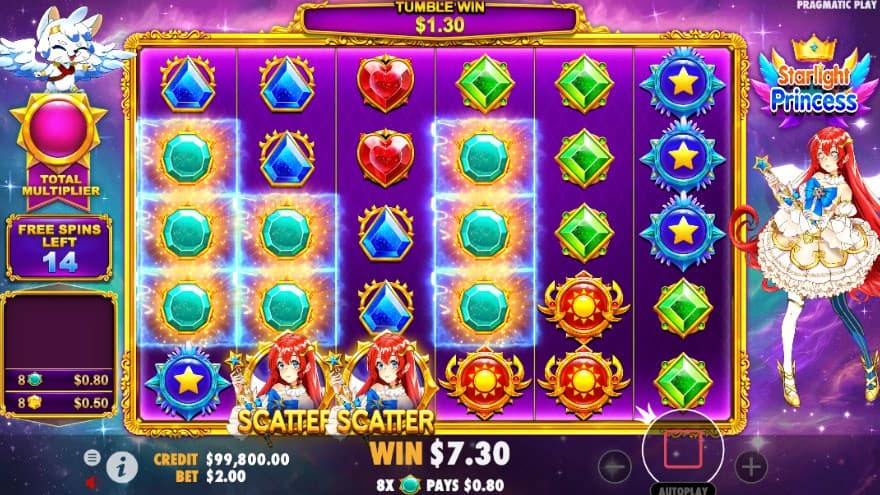 The lower paying symbols consist of gems in the colors yellow, turquoise, green, blue and red. If you land 12 or more of the same symbol type, it gives between 2X to 10X the bet. The higher paying symbols consist of beautiful emblems depicting a star, a moon, a heart and a sun. If you land 12 or more of the same symbol type, it gives between 12X to 50X the bet. The Starlight Princess is the game's scatter symbol and if you get 6 of these it gives 100X the bet. During the spins, you can also land heart-shaped multiplier symbols in the colors green, blue, pink and yellow. We tell more about these in the feature section. Let's find out what the features do.