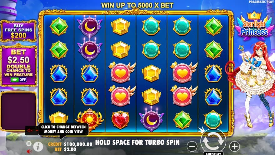 This is a slot that is almost a copy of Pragmatic Play's previous slot Gates of Olympus, where the only difference is its theme. Like this previous slot, we are once again up among the clouds, but instead of meeting the mighty god Zeus at the gates of Olympus, this time we get to meet the charismatic Starlight Princess who certainly has a bunch of enchanting things to show us during the visit. It is a slot that has 6 reels and 5 rows, where you create winnings by landing 8 or more of the same symbol types on the reels. It is truly a wonderful feature that this Pay Anywhere mechanic has, where winnings can be created from scattered symbols on the reels. What makes the spins incredibly exciting and adrenaline-filled are the various multiplier symbols that can land. Where these can land with values of between 2X up to an incredible 500X the bet, in which they are then applied to any winnings that they land with.