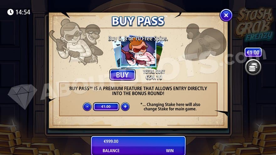 Stash & Grab Frenzy is set inside a bank vault full of gold bars. The reels are placed on what seems to be the round door that enters the vault. It has a pillar on each side and dark blue walls. The music sounds like a mix of cheerful jazz music and the theme song of a detective movie, with a lot of brass instruments. To make a win, you need to land at least 3 of the same symbols on one of the 10 paylines going left to right. A win must start on the first reel to the left, and you can play the game on all sorts of devices such as desktops, notepads, and mobile phones.