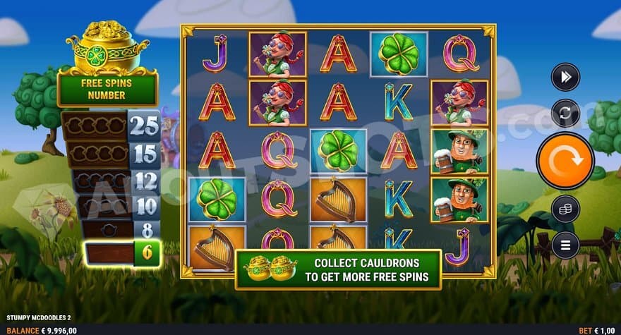 Once again, we find ourselves in the Irish countryside with Stumpy and his wife, Penny. We can see green hills in the distance – although not as saturated as usual in the world of leprechauns – and a few trees. We have seen this little Irish fantasy creature in tons of games like Lucky Leprechaun Clusters and Murphy’s Pots, to name a few. Apart from green hills, there is usually a rainbow involved since the legend says that leprechauns store treasures at the end of the rainbow. There’s no rainbow over the lands of Stumpy McDoodles and his wife Penny, though. The game has an Irish-sounding theme song, although it isn’t as close to the usual leprechaun game folk music, missing the flutes. To the left of the reels is a Free Spins Number table, where the player can collect cauldrons to win extra free spins when the feature is activated. To make a win in this fantasy world, you’ll need to land 3 of the same symbols on any of the 40 paylines going left to right, starting with the first payline to the left. Stumpy McDoodles 2 is available on desktops, notepads, and mobile phones.