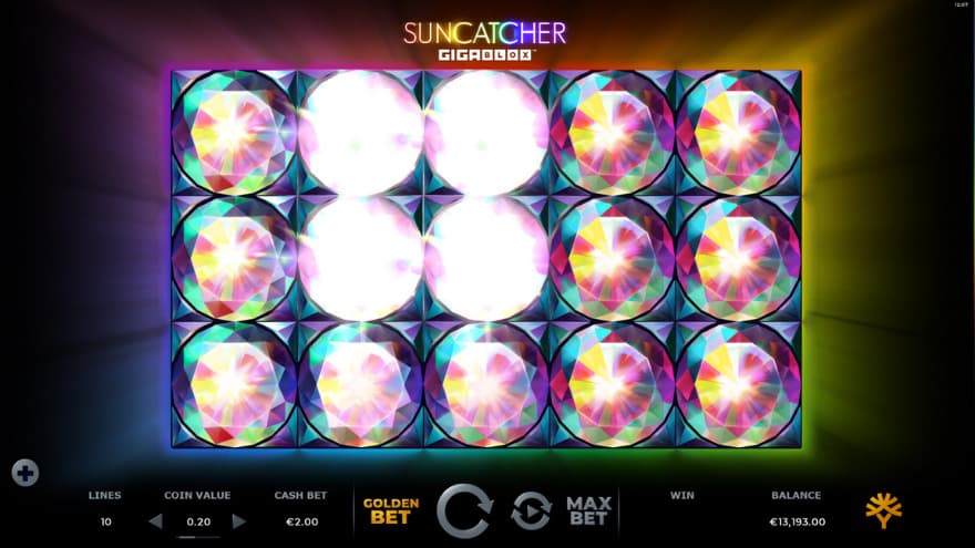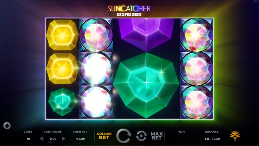 What features are in the video slot Suncatcher Gigablox? The features are Gigablox, Wild Respins and Golden Bet.
