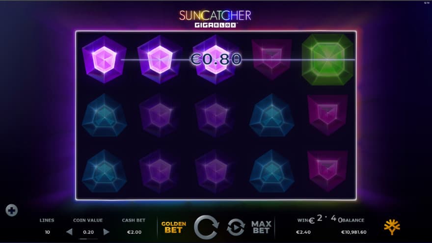 Suncatcher Gigablox is a video slot from Yggdrasil that has 5 reels and 3 rows. There are 10 paylines which pays both ways, where winning combinations can be created by starting on either the left or right side of the reels. You can choose between making a Min.bet of 0.1 and a Max.bet of 500 in normal mode, but by using Golden Bet you can choose between making a Min.bet of 0.2 and a Max.bet of 1000. It is an RTP of 96%, Hit frequency of 22.26% and a Low/Medium volatility. When it comes to the game's potential maximum win, it's 1430X the bet.