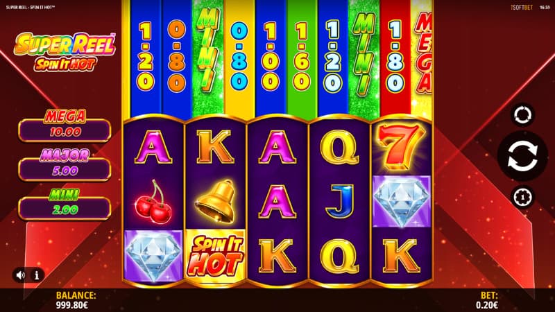Just like its name, this slot really has super reels, where you can take part of great direct prizes and jackpots, but to succeed, the right number of symbols must land. On the main reels, among others, the lower paying 10, J, Q, K and A can land. The higher paying symbols consist of cherry, bell, lucky 7 and a giant diamond. The game's wild symbol helps to create more winning combinations by substituting for other symbols. The only symbols it does not substitute for are the scatter and Spin It Hot symbols. The wild symbol has the text wild written on it in golden text. The scatter symbol has the text free spins on it and by landing 3 or more of these, the free spins feature is activated. The most exciting symbol to land in this slot, however, is the Spin It Hot symbol, if you land 6 or more of these, you get to take part in spins that can certainly succeed in paying big wins. Let's find out what the features do.