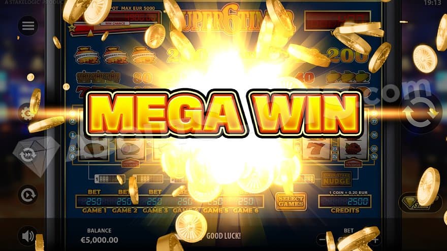 The Super Stake is a golden button you can press to increase the bet and get some extra perks. To use the Super Stake, you must play all 6 games on all 8 reels. Hitting the Super Stake will double your bet and activate the Nudge feature. At the end of a spin, reels 2, 4, 6, and 8 will automatically nudge up and/or down if it can generate a win. Max two reels can nudge on each spin.