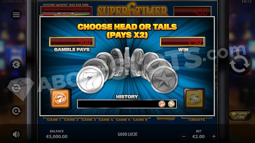 You can choose to gamble any win in an all-or-nothing coin flipping feature. If you foretell the correct side of the coin, your win will be doubled, and you can choose to gamble again or collect your money. If your guess is wrong, you’ll lose the win. The gamble feature is voluntary; you can always choose to collect your winnings.