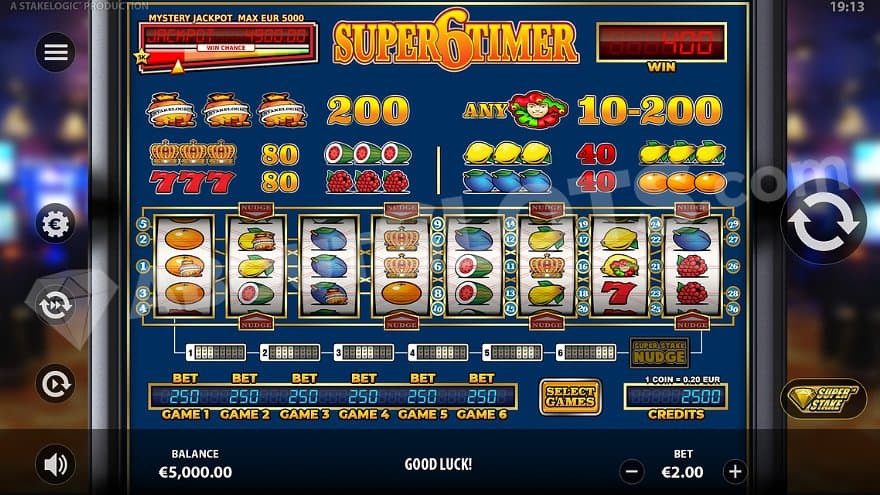 Super6Timer is a new casino slot from Stakelogic where the player can choose to play one game on three reels or up to six games on eight reels. The game is easy to follow with low volatility and a retro fruit symbol look. It resembles the game developer’s previous games Twin4Timer, Up4Timer, and most of all the Up6Timer, where the player can also choose between 1 and 6 games on 3 to 8 reels. Stakelogic has added a progressive Jackpot with a win up to €5000 to spice up the low volatility and modest max win of 40X the bet. As many times before, you’ll also find the Super Stake mode, giving you some nice perks if you double the bet.
