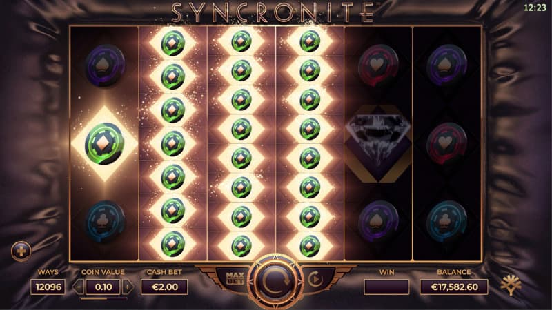 There is no bonus to take part in but believe me once you start to spin the reels and discover the wonderful features that are available, you quickly forget it. This slot has an RTP of 96% and it is a medium volatility. During your spins, you can with a little luck manage to scoop up an incredibly large maximum win of the 64'800X amount you bet. Syncronite Splitz has a very luxurious feel that permeates, and it feels like you have ended up in a VIP room. Where you are surrounded by luxurious symbols and the atmosphere gives a pleasant feeling.