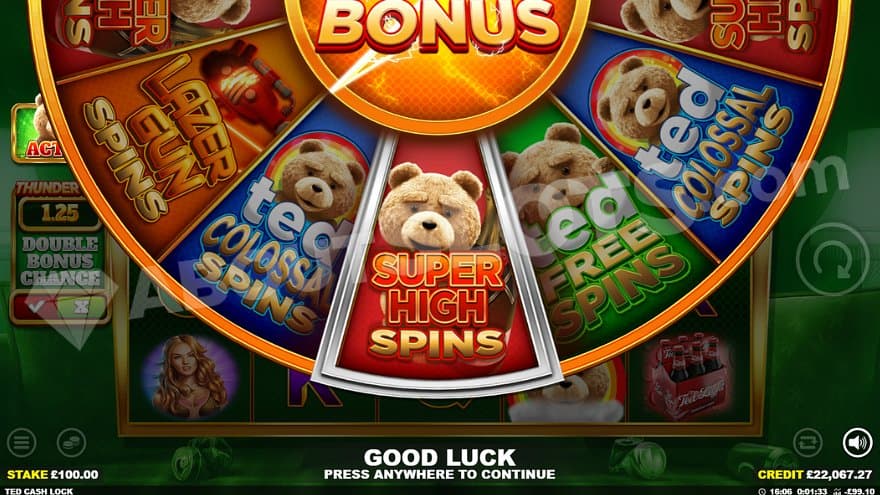 The Ted Bonus Wheel starts spinning as soon as you land 3 Thunder Buddies Bonus Scatter Symbols. The wheel will stop at one of the three free spins bonus rounds: Ted Colossal Spins, Lazer Gun Spins, or Super High Spins.