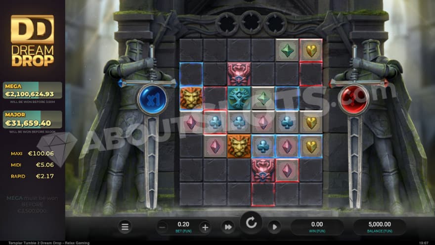 Templar Tumble 2 Dream Drop is a video slot from Relax gaming that has 6 reels and 7 rows. During the spins some positions will be blocked, but these can be unlocked and thus you can get up to 117649 ways to win. You can choose to make a Min.bet of 0.2 and a Max.bet of 100. The game has been created with two different RTPs which are either 94% or 90%, with 12% of the RTP being the Jackpot contribution. Templar Tumble 2 Dream Drop has a hit frequency of 21.95% and a high volatility, where you can win up to 20,000X + Progressive Dream Drop Jackpot.