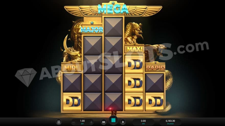 You will then be moved to a new location, where 5 different columns are displayed with the different Jackpots you can obtain. These are Rapid, Midi, Maxi, Major and Mega, with 2, 2, 3, 4 and 5 positions respectively. During this bonus game, you are guaranteed to receive one of these five jackpots, where the column that fills up first being the jackpot you receive. The jackpots are progressive and start with the following values: