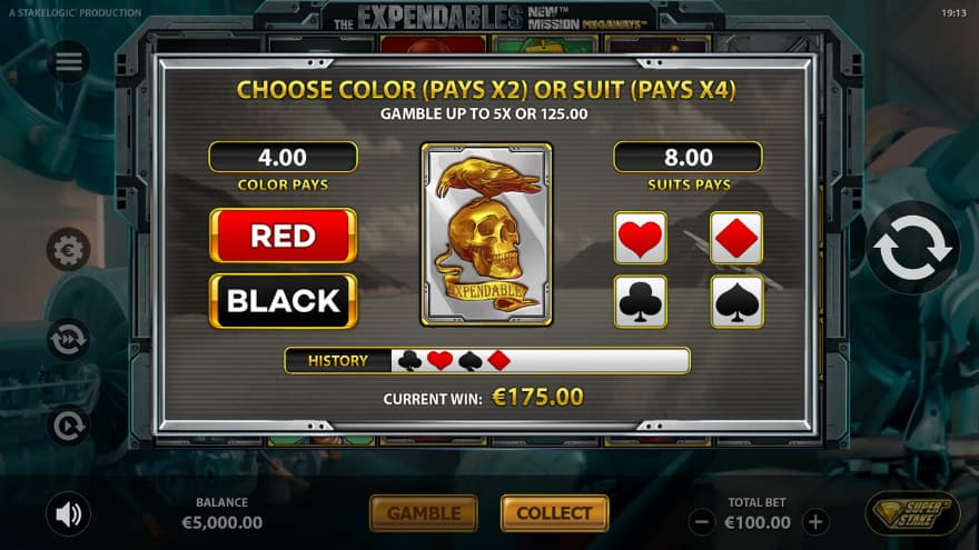 When you create a win within the base or bonus game, you can choose to use the Gamble feature. Then you can choose between guessing the right color or suit on a card that doubles or quadruples your win if you guess correctly. If you guess wrong, you will instead lose everything you have won. You can continue until the current win limit has been reached and if you already have created a win that exceeds the win limit for the Gamble, this feature will not be activated.