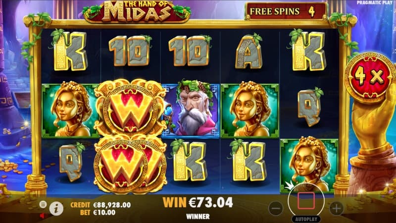 We have ended up in a place where most things are adorned with gold, as someone has probably ravaged around with the hand of Midas. A variety of gold-decorated symbols can land on this slot. The lower paying symbols are 10, J, Q, K and A. The medium paying symbols are a golden chalice, a bowl of fruits and a treasure chest filled with gold. The higher paying symbols are the golden girl Marigold, the god of wine Dionysus and for sure Midas himself. The game's wild symbol is beautifully decorated and comes with a large golden W. To get to the free spins feature, you need to land 3 or more of the game's scatter symbols. As you can almost figure out, this symbol is the golden Hand of Midas and has the text scatter on it. Let's find out what features you can expect to see during the game.