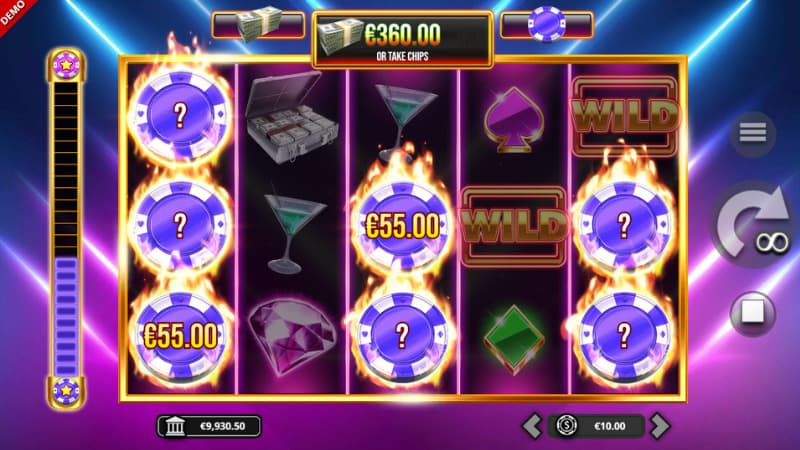 We have ended up at a slot that has a real VIP theme, where a luxurious feeling is permeated during the spins that are made. It can land a wide variety of symbols on the reels and the lower paying symbols consist of hearts, clubs, spades and diamonds. The higher paying symbols consist of cocktail, lucky dices, cash case, pink gem and hot 7. The game's wild symbol helps to create more winning combinations by substituting for all paying symbols. To take part in the game's Double-Up free spins, you need to land 3 bonus symbols and these consist of a flame with the text bonus on it. Although many symbols have already been mentioned, it can land significantly more and these are the Chip symbols. They will play a big role, which we will tell you in more detail a little further down. But something that can be mentioned now is that they can land in the colors blue, bronze, gold, green, black, pink, purple, red and silver. Let's find out what the different features do.