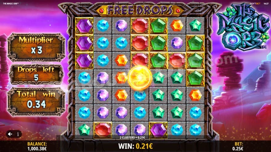 If you land 3 scatter symbols at the same time, the Free Drops feature is activated, but you can also activate this bonus game through the Magic Orb feature. You are then greeted with free drops, and you also get to enjoy a win multiplier. This win multiplier will increase by 1X with each cascade that occurs, and it stays during the spins, where there is no limit on how big it can get. The Magical orb can activate any of its six modifiers during the spins.