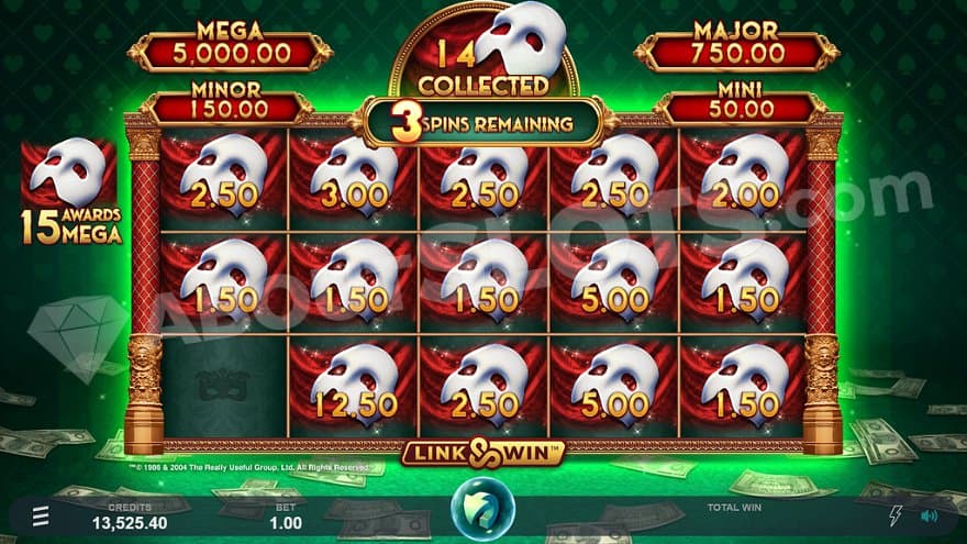 The Link & Win Symbol is the Phantom’s white mask on a red curtain. Each symbol has a cash prize, and you need to land at least 6 symbols to trigger the Link & Win feature. You can’t make regular wins with the symbol, hence landing less than 6 won’t give you anything. It’s possible to land up to 14 symbols in the base game. Each symbol has a value of 1.5X, 2X, 2.5X, 3X, 5X, 7.5X, 12.5X, 20X, 50X, 150X, or 750X the bet.