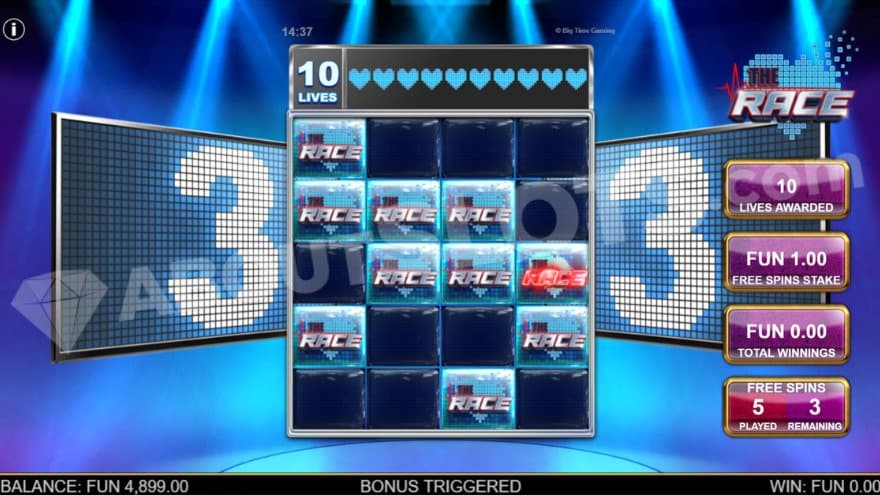 The free spins start with as many spins (lives) as there are Scatter Symbols on the grid when you run out of spins in the Heart Bonus Round. The maximum number of lives is 20, and the feature will terminate if you fill all positions with symbols.