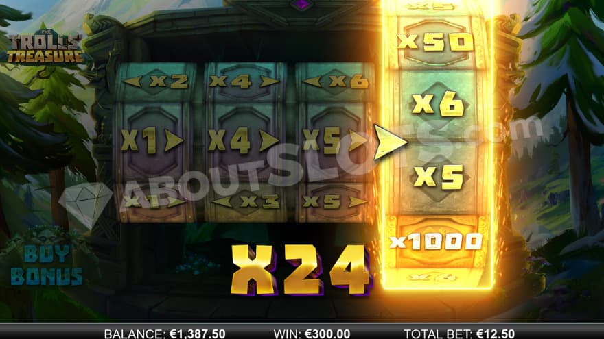 The Trolls' Treasure is a video slot from ReelPlay that features 5 reels, 4 rows and 50 paylines. One can choose between making a Min.bet of 0.50 and a Max.bet of 250. It is an RTP that is higher than the average, where we have an RTP of 96.74% which increases additionally to 97.70% when using the bonus buy feature. The Trolls' Treasure has a medium volatility (3.5/5), where you can win up to 1000X the bet.