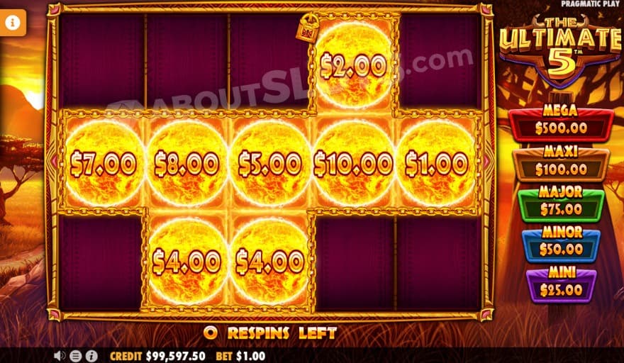 The money symbols that you had when activating the feature will be moved to the middle reels and if you land a money symbol that links adjacent or horizontally, all their values will increase to the next value.