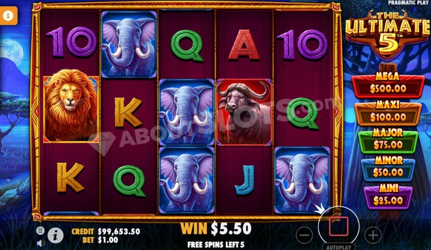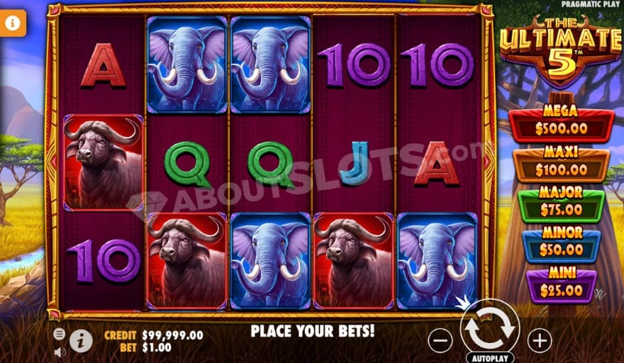 The Ultimate 5 is a new casino slot from Pragmatic Play where we visit the African savannah and meet their mighty animals, the big five. These majestic and mighty collection of animals consists of African buffalo, African bush elephant, black rhino, leopard and lion. Yes, it is indeed a mighty troop of animals and why all of these are included in this category is beyond doubt. You can find them in most parts of Africa and now also within this slot, where we together with these animals can create some festive wins. Let's dive into this slot and find out what you can expect to see during the spins.