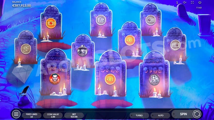 The game takes place at a graveyard next to a spooky castle. Fog is slowly drifting past us, which helps in creating a horrifying setting. The original Vampires game had some great visuals for its time, but you can really see how the graphics have developed since. We wouldn’t necessarily say that its hyper-modern, but the game looks sharp and, most importantly, clean. However, the strongest asset the game has is its soundtrack. Not only is the tune as spooky as it should, but even the sound of the spins suits the theme, which is a great touch.
