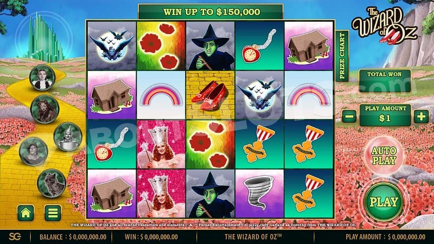 The Wizard of Oz is a video slot from SG Digital with 5 reels and 4 rows. The Min.bet is 0.50 and the Max.bet is 30. The game’s volatility is set on medium, the RTP is 86.99%, and the max win is 5000X the bet. About one spin out of 4.5 equals a win, with the hit frequency 22.57%, and the average bonus payout is 11X the bet.