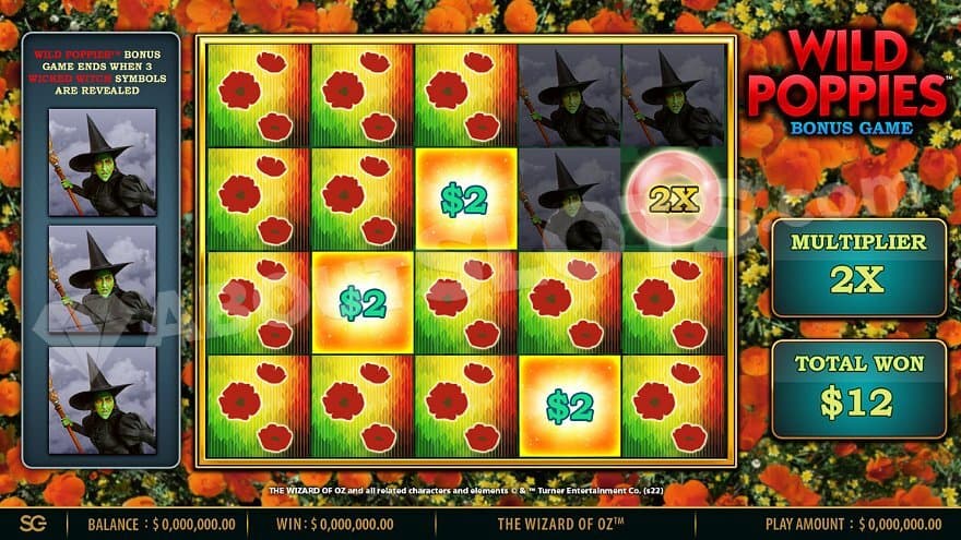 The red poppy flower is the scatter symbol for this bonus game. Collect 3 poppies anywhere on the reels to activate this feature. It starts with all the reels turning into a game board, where all the positions show the flower. A price sum or a Wicked Witch that doesn’t pay anything will appear by clicking on the flower. You continue to turn over the cards, adding up all the wins, until three witches have been chosen and the game is over. Somewhere among the 20 positions is also a 2X multiplier that multiplies the wins.