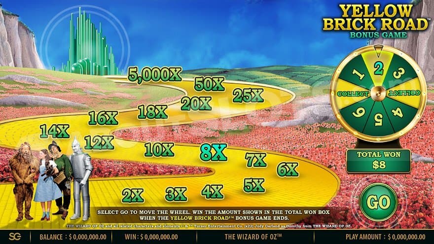 The Yellow Brick Road is located to the left of the reels, leading all the way to Emerald City. To activate the feature, you’ll need to land one of each of the 5 scatter symbols (Dorothy, Cowardly Lion, the Tin Man, the Scarecrow, and Toto) anywhere on the reels. The road to the city is filled with multipliers going 2X, 3X, 4X, 5X, 6X, 7X, 8X, 9X, 10X, 12X, 14X, 16X, 18X, 20X, 25X, 50X, and 5000X. You start by spinning a wheel containing the numbers 1-6 and two positions saying collect. By hitting any of the numbers, you’ll walk as many steps as the number on the road’s multiplier. If you, for example, are standing on 3X and hit number 2 on the wheel, you’ll move to 5X. You get to respin the wheel until it hits collect. The win is multiplied by your main game bet, so playing for 1€ will give you 8€ if you finish this feature on the 8X multiplier.