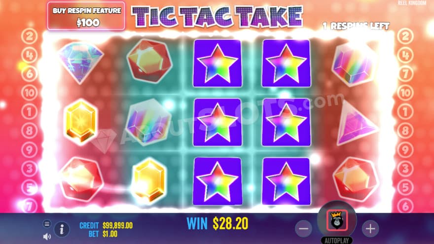 If you want to take advantage of the Tic Tac Take Respin feature right away, you can use the Bonus Buy feature. You pay 100X the bet and then the bonus game is activated. You will then land a random amount of X and O symbols, which will give you between 1 to 8 respins from the start. Within the Bonus Buy, the RTP remains 96.63%.
