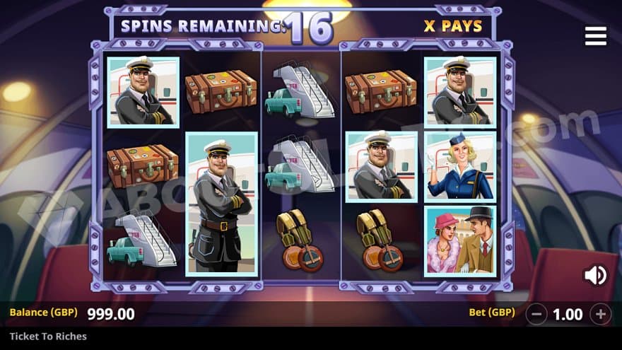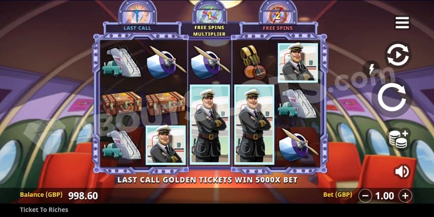 Ticket to Riches is a new casino slot from Northern Lights Gaming with a retro flight theme. We go back to a time before the internet and no-frills carriers, where the airlines still didn’t charge the passengers for every little service, and mobile check-ins were unheard of. In Ticket to Riches, we find a captain, a flight attendant, and some travelers ready to take off. Collecting tickets in the base game will add free spins, a free spins multiplier, and boarding passes to the Last Call feature. The game awards wins as long as you land symbols on adjacent reels, giving the player 243 ways to win on each spin. This is the final call; we’re ready to take off.